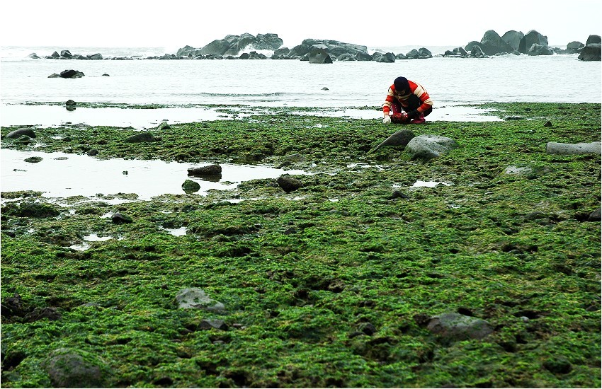 翠綠的海藻,每年冬季肆意地生長在這一大片岩石之上,一生一死不停循環,所構成的生態系,逐漸堆疊出這些美麗的藻礁。